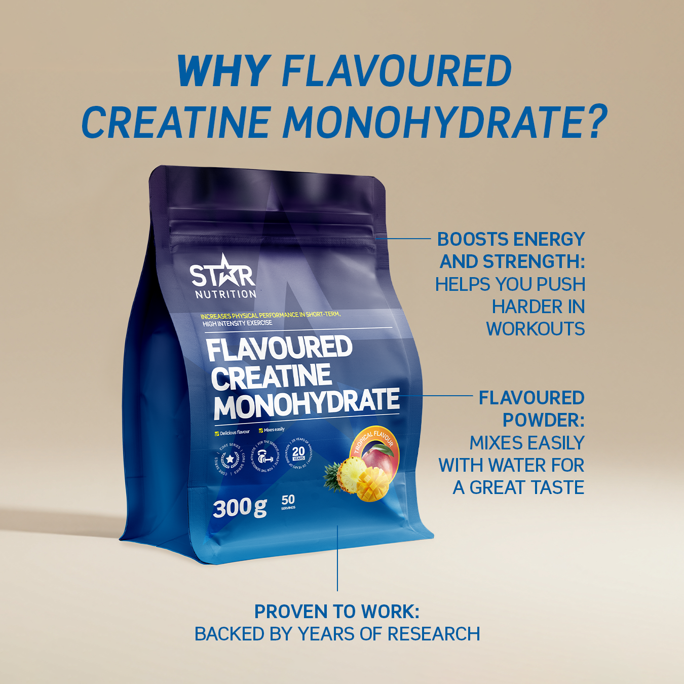 Star Nutritions Flavoured Creatine Monohydrate leverer kreatinmonohydrat i pulverform, med gode smaker som gjør det enkelt å få i seg den daglige dosen.